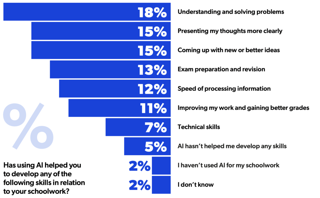 조사에 따르면 학생의 98%가 이미 AI를 과제 수행에 활용 중이며, 완전히 사용하지 않는 비율은 고작 2%에 그쳤다. AI는 주로 글쓰기 초안 작성, 요약, 번역, 수학 문제 풀이 등에 활용되고 있었다.