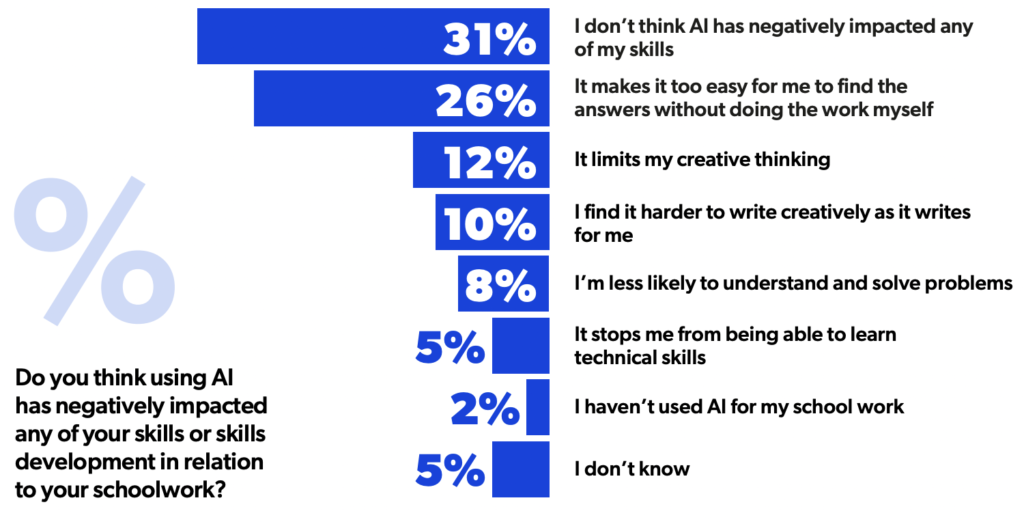 - 25%는 “AI가 답을 너무 쉽게 제시해 사고력과 노력이 약해졌다”고 말했고,