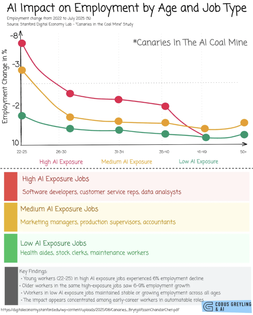 연구에 따르면, 소프트웨어 개발이나 고객 지원처럼 AI 도입 가능성이 높은 직종에서는 특히 초기 경력자(early-career workers)의 고용 규모가 상당히 감소했다. 즉, 젊은 인력이 상대적으로 더 취약한 상태에 놓여 있다는 것이다.